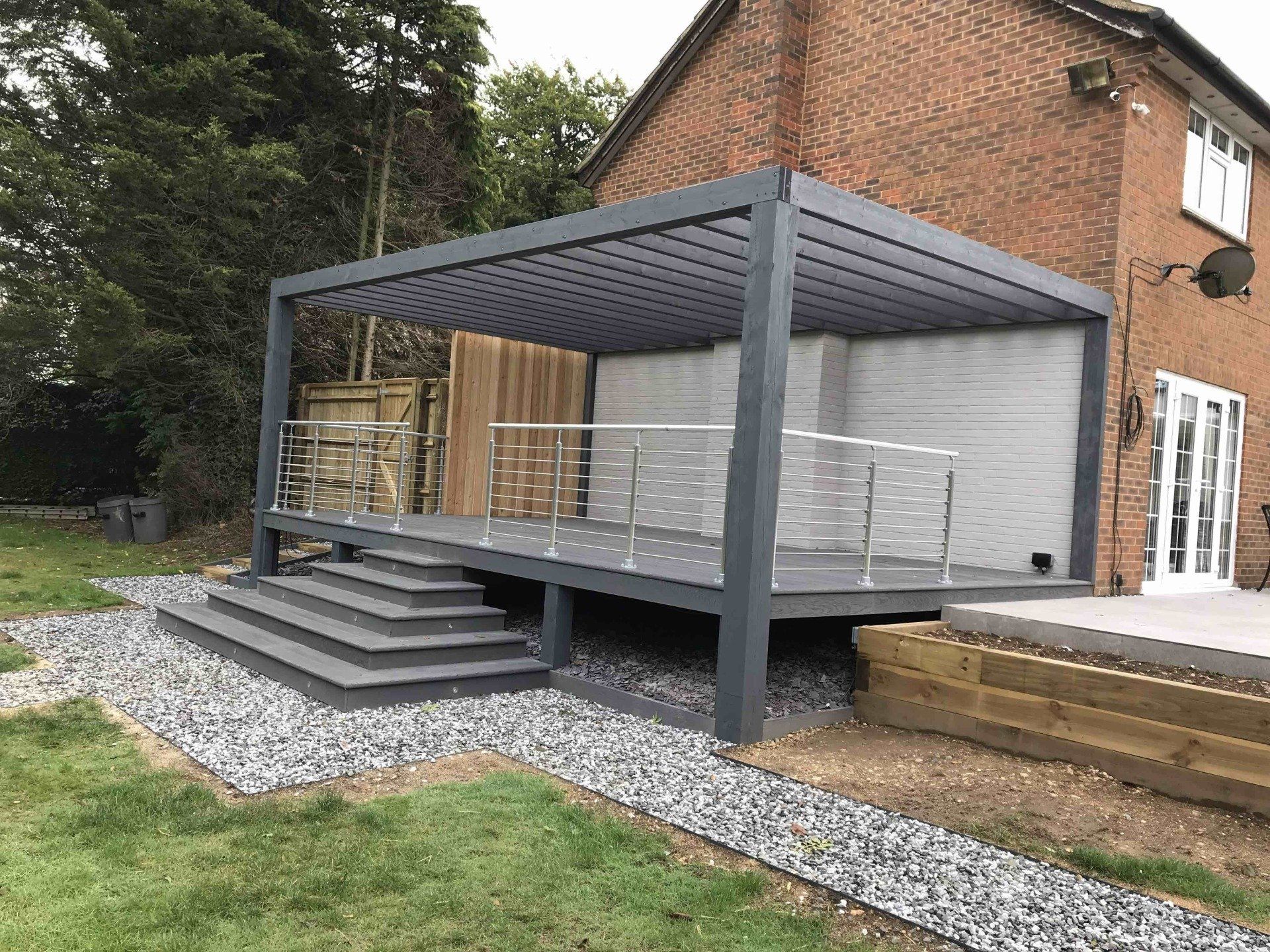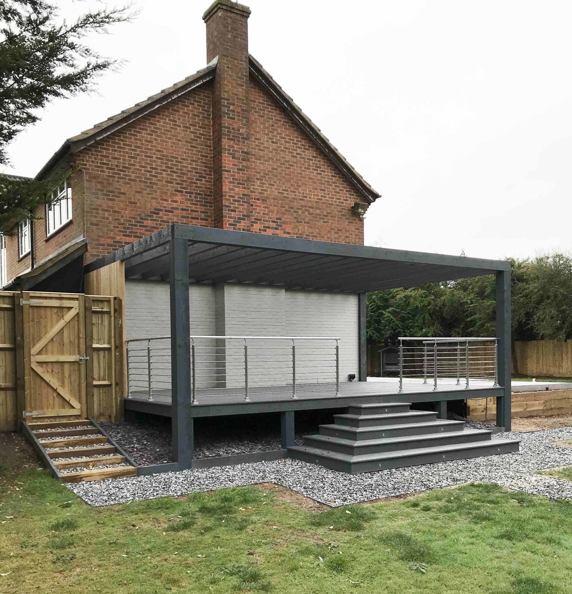 This is another garden project which involved quite a lot of construction work. We built a bespoke shed for the client with log store to the side. We built them a tiled patio with planters and lighting and a separate decked area using Millboard decking and a pergola to complete the look. There is also a standalone pergola for an additional entertaining area. We built a summer house in the garden which included a Sarnafil roof, anthracite